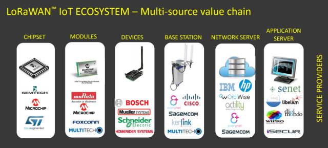 国际LoRa联盟成立之初,就特别注重生态系统建设。在联盟的推动下,LoRa的产业链已相当成熟,从底层的芯片、模组到设备制造、系统集成,都有相关厂商。