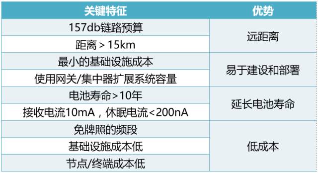 远距离通讯、长电池寿命、大系统容量、低硬件成本。
