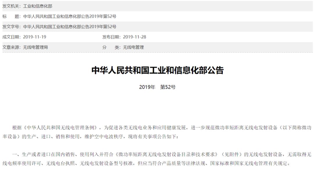 几天前,2019年11月28日,工信部发布第52号公告。公告的主要内容,涉及微功率设备的范畴定义、无线频率的使用限制等要求,还有一些管理规定和举措,一共10条内容。