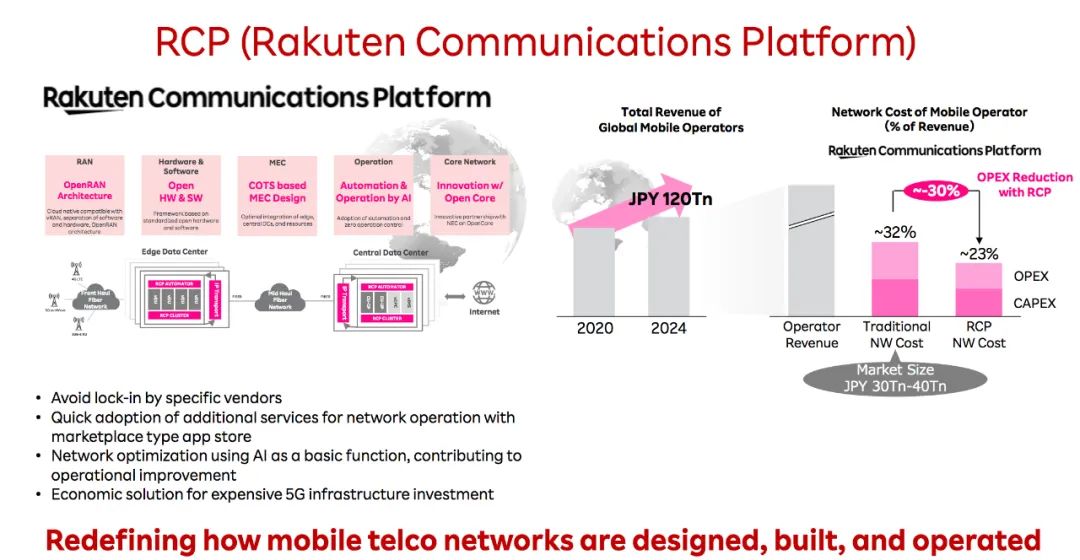 简而言之,乐天在发布会上表示,RCP将重新定义移动通信网络的设计、部署和运营运维方式。乐天的野心就是基于自身的端到端虚拟化/云化移动网络部署经验,向全球其他运营商“售卖”RCP解决方案和服务。
