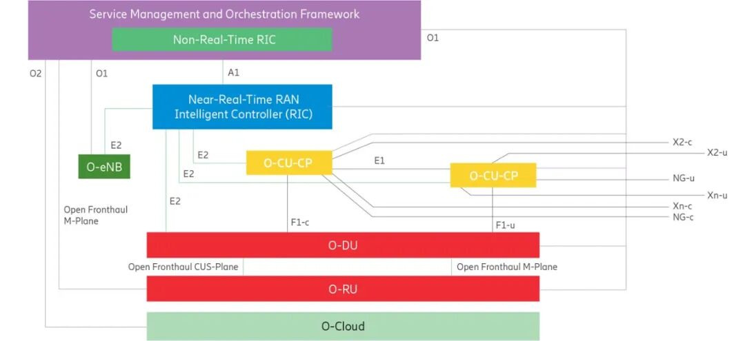 但O-RAN进一步开放前传接口,并在管理层和RAN新引入了Non-Real-Time RIC和Near-Real-Time RIC两个控制器,同时新增了A1、E2、O1、O2等接口。