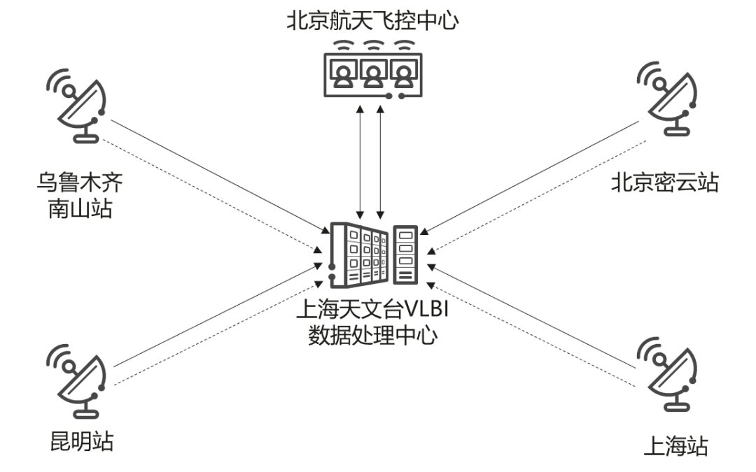 我们国家的VLBI测轨分系统,由上海佘山站、北京密云站、乌鲁木齐南山站、昆明凤凰山站和上海天文台VLBI数据处理中心共同组成。“四站一中心”分布于天南地北,充分利用了我国的国土纵深。