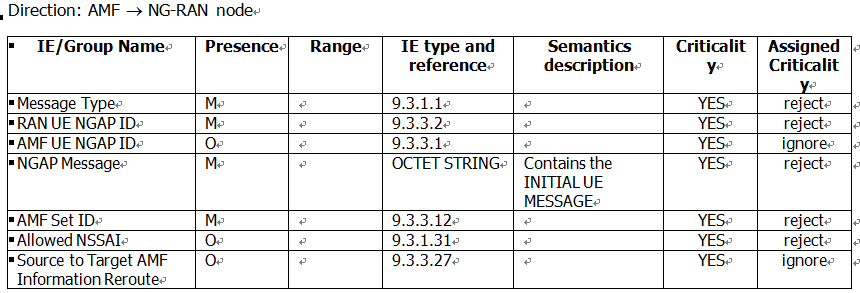 AMF将注册消息发回给gNB使用的消息是REROUTE NAS REQUEST,该消息用于将INITIAL UE MESSAGE消息重新路由到其它AMF。我们先看消息的定义:
