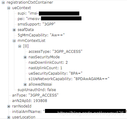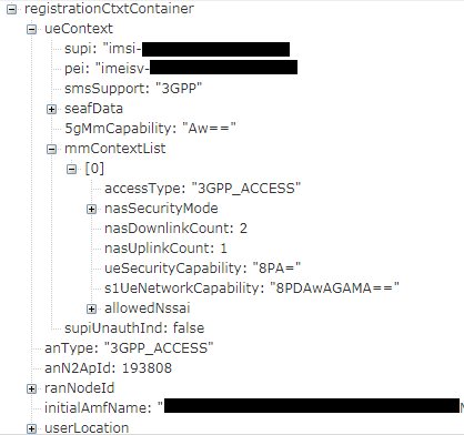 从上图可以看到目标AMF收到了Namf_Communication_N1MessageNotify消息之后又和UE重新进行了一次完整鉴权,也就是目标AMF和UE又协商了一个新的安全上下文。我们抓取信令的业务场景是UE使用SUCI注册,显然初始AMF已经执行完了一次鉴权流程,从N1MessageNotify消息的内容RegistratonCtxContainer也能看到携带了安全上下文,如下图。