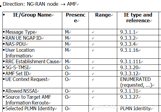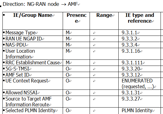 1.2.4.7b(B) Initial UE message基站从根据收到的REROUTE NAS REQUEST提取出相关信息,重新组合成新的INITIAL UE MESSAGE发给目标AMF,消息名和第一次基站发送注册消息给初始AMF的消息名称一样,只是携带的字段不同。我们再复习一下INITIAL UE MESSAGE消息的定义,如下图。