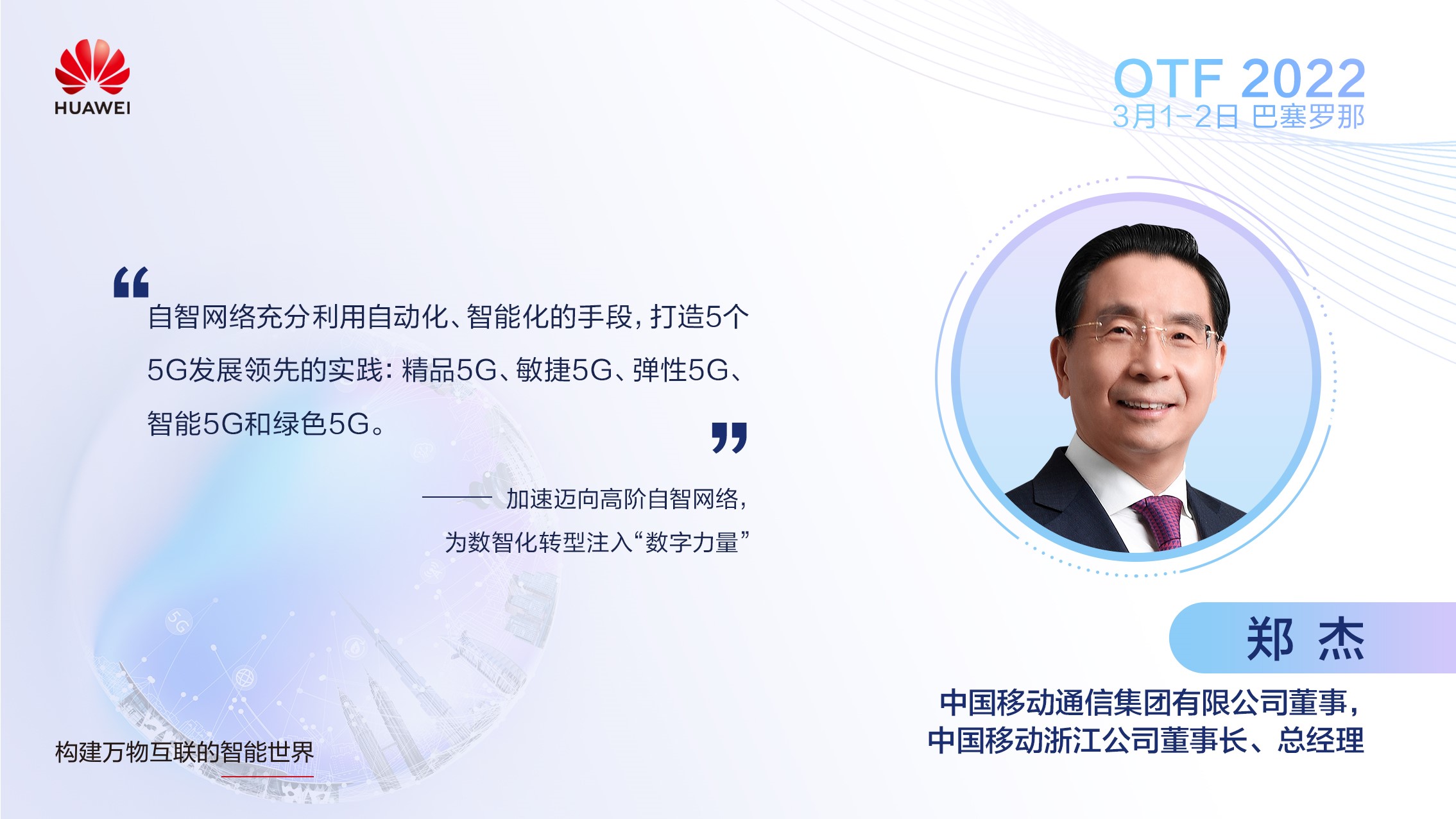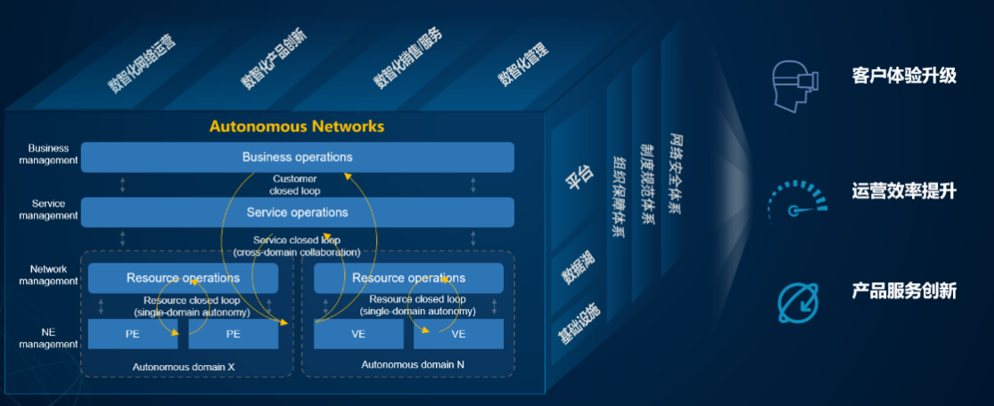 在MWC22巴塞罗那期间举办的华为OTF(运营转型峰会)上,中国移动浙江公司董事长、总经理郑杰先生发表了“加速迈向高阶自智网络,为数智转型注入数字力量”的主题演讲,提出中国移动浙江公司通过自智网络实现了全球领先的5G业务发展。自智网络应数智化社会发展而生,它把AI的新理念、新技术广泛地、充分地应用到网络生产实践中,实现主动式、预防式、敏捷式运营运维。自智网络基于数字基础设施、数据湖以及AI与算力融合的平台,结合组织保障体系、制度规范体系和网络安全体系,面向消费者和垂直行业客户提供新型网络与ICT服务,实现数智化网络运营、数智化产品创新、数智化产品销售和服务、数智化管理,赋能千行百业的数智化转型升级。最终助力浙江移动实现 “数智化转型创先、高质量发展创优”的愿景。