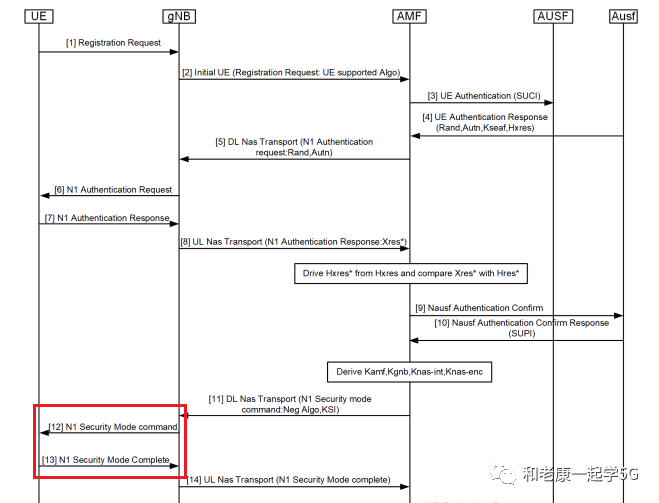 5G系统空口加密和完整保护性算法继承了3G和4G模式;终端在RRC连接完成之后,无线网向终端(UE)发出"SECURITY MODE COMMAND"命令;根据消息中的加密和完整性保护算法执行完毕后,终端回复“SECURITY MODE COMPLETE"。