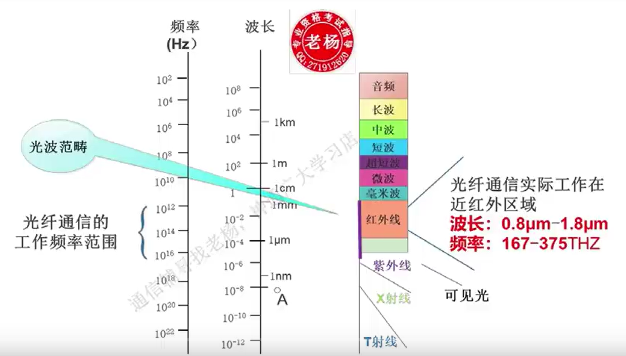 传输频带宽,通信容量大(光纤通信的工作频率为10^12Hz~10^16Hz)