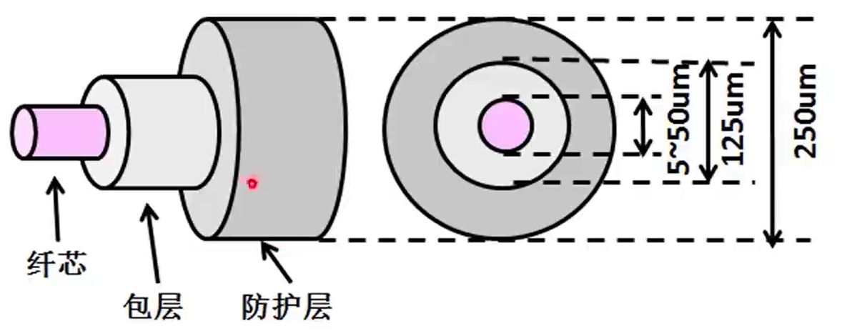 光纤的基本结构一般是双层或多层的同心圆柱体,如下图所示。中心部分是