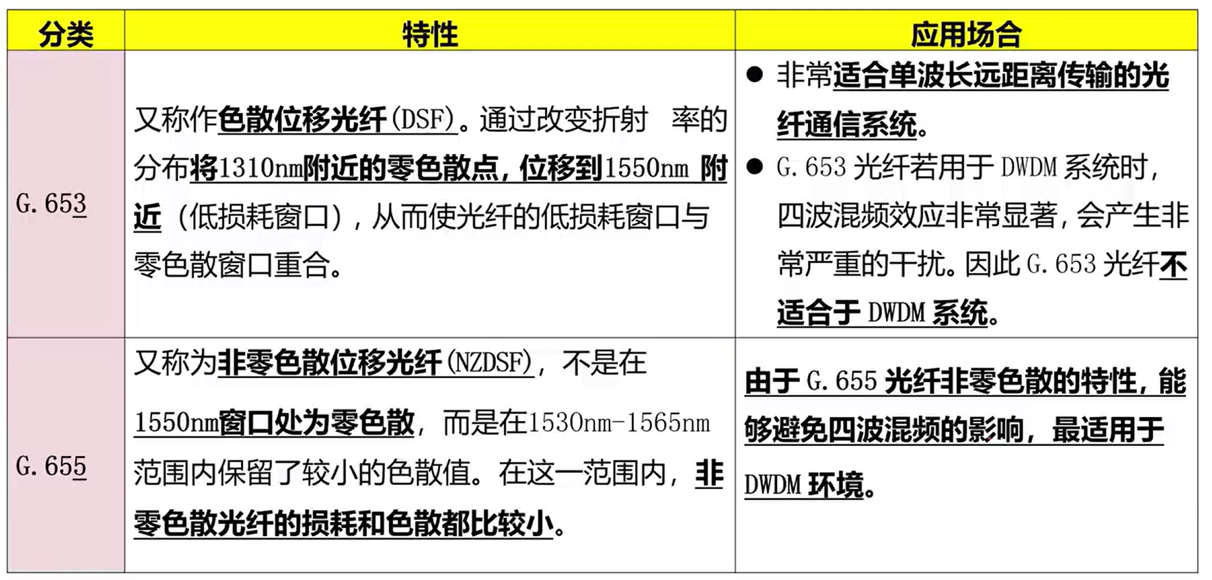 G.655 的非零色散光纤的损耗和色散都比较小(折中),适用DWDM,无四波混频效应。