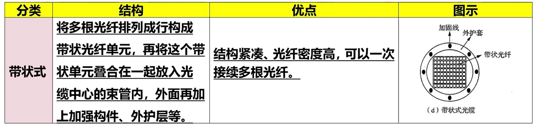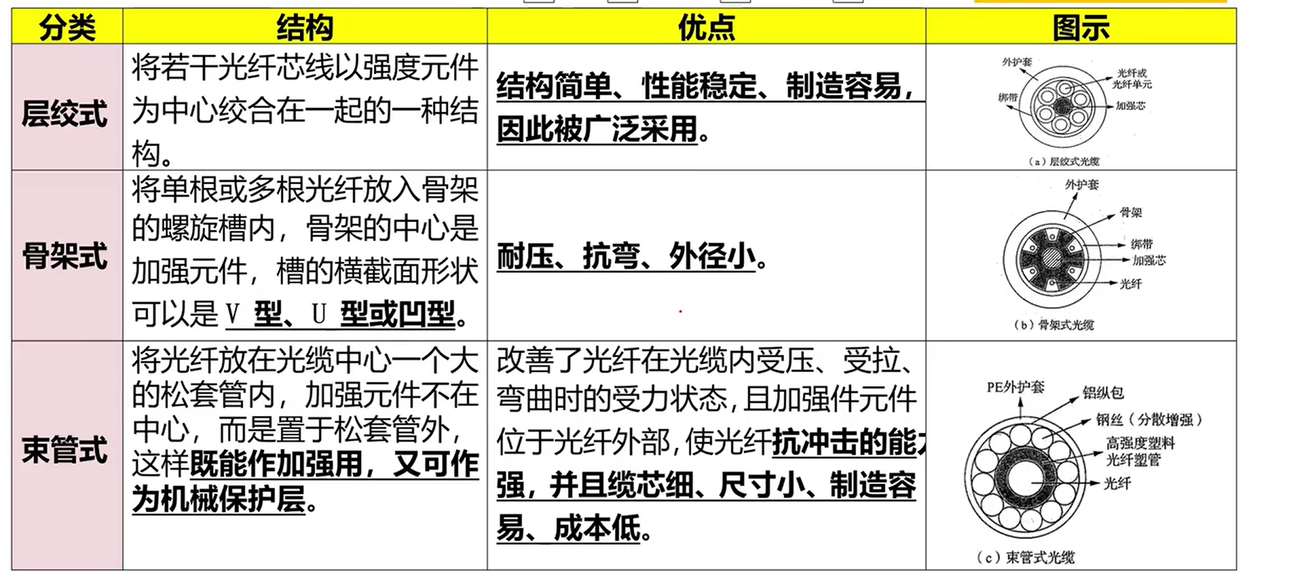 光缆的分类:按照光缆结构可分为层绞式、骨架式、束管式、带状式等