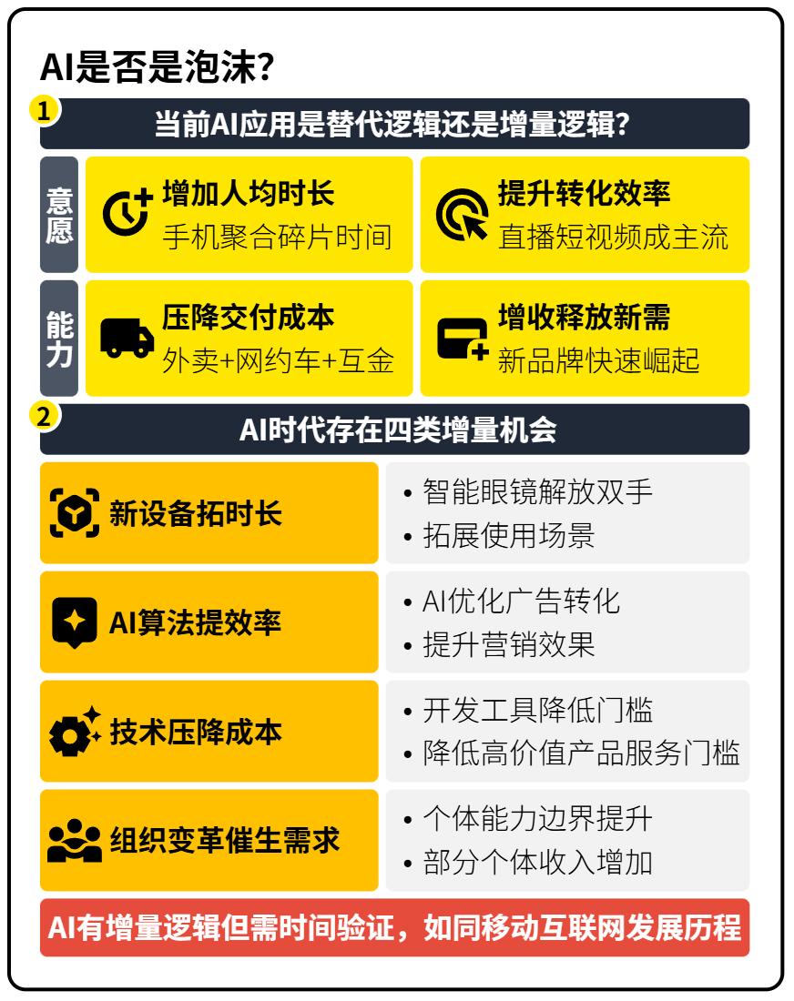 正如移动互联网从2007年iPhone发布到2016年直播电商爆发,用了近10年时间才完成增量逻辑的验证。AI的故事,可能也需要更多耐心。