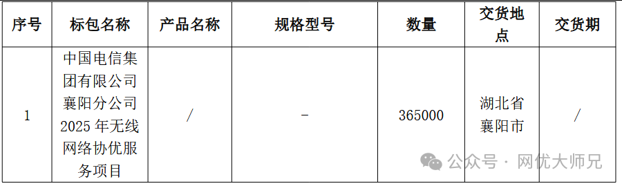 标题: 中国电信集团有限公司襄阳分公司 2025 年无线网络协优服务项目招标公告,预算:36.5W