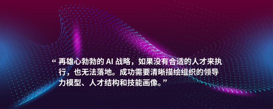 再雄心勃勃的AI战略,如果没有合适的人才来执行,也无法落地。成功需要清晰描绘组织的领导力模型、人才结构和技能画像。同样重要的是,AI项目如何与企业的文化价值观保持一致。