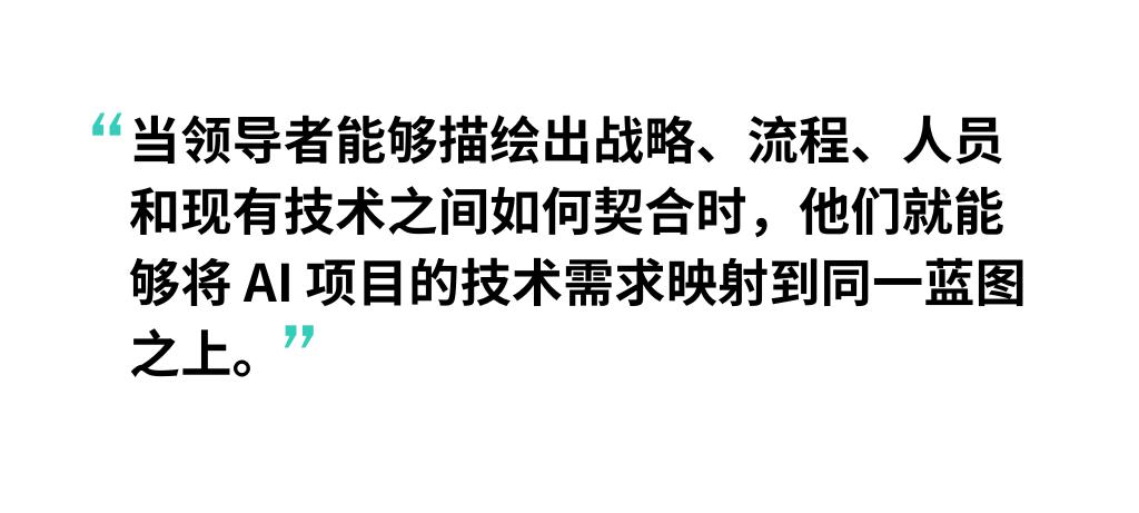 当领导者能够描绘出战略、流程、人员和现有技术如何契合时,他们就能够将AI项目的技术需求映射到同一蓝图之上。