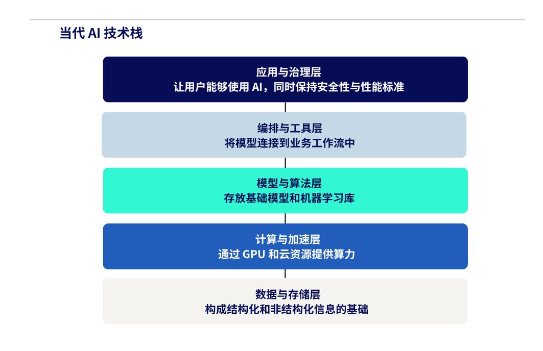 下图所示的当代AI技术栈由五个相互关联层组成: