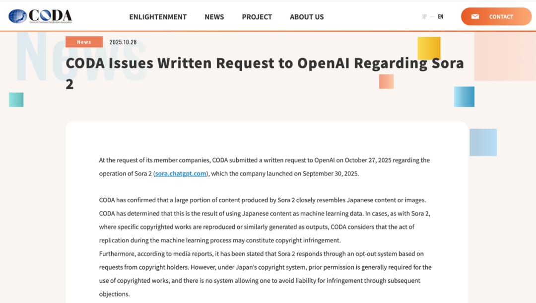 CODA认定,OpenAI旗下视频生成工具Sora 2生成的大量内容与日本内容作品或图像极为相似。这是将日本内容作品用作机器学习数据的结果。CODA认为机器学习过程中的复制行为可能构成版权侵权。CODA向OpenAI提出要求,未经许可不得将其会员的内容用于机器学习。