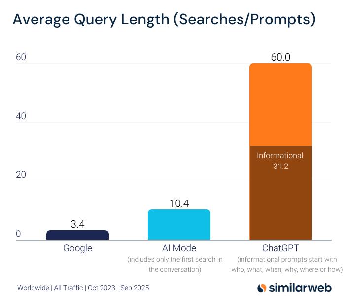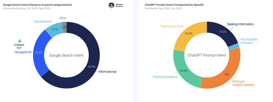 值得注意的是,「导航型搜索」即通过搜索跳转到特定网站,几乎不存在于ChatGPT中,而在谷歌上却呈上升趋势。此外,在「交易型意图」方面(例如寻找可购买商品),谷歌的占比为