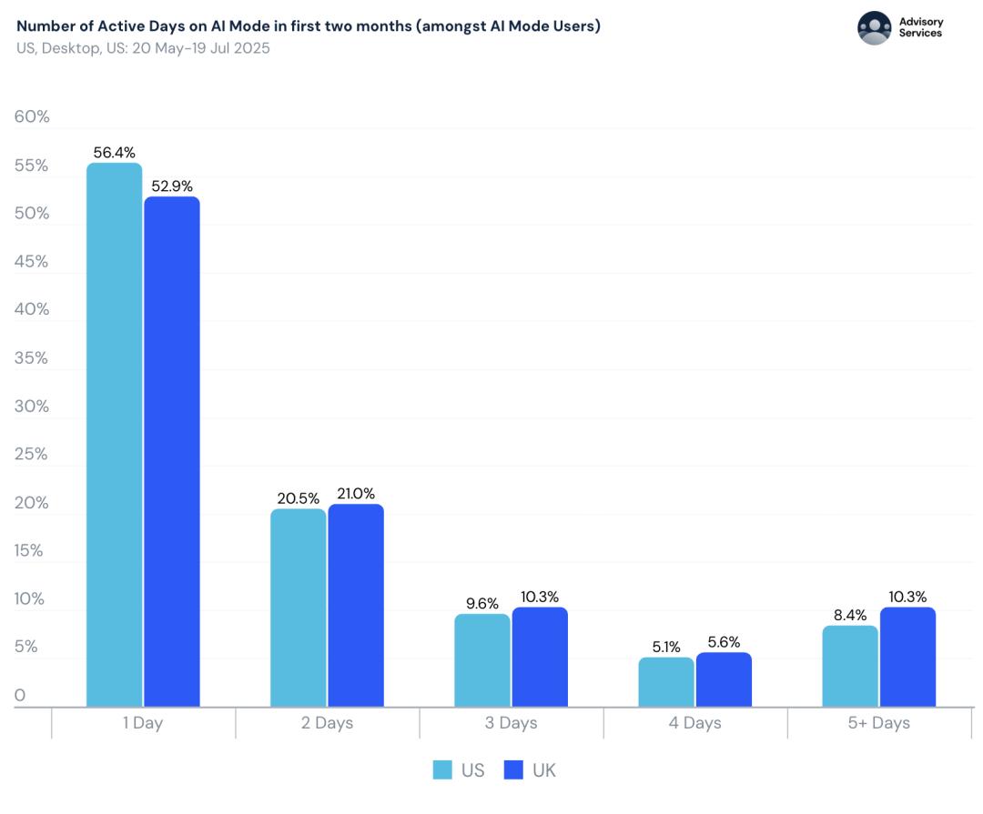 AI Mode先在美国上线,很快扩展到英国、再到全球100多个国家;很短时间内,就成为首个访问量突破