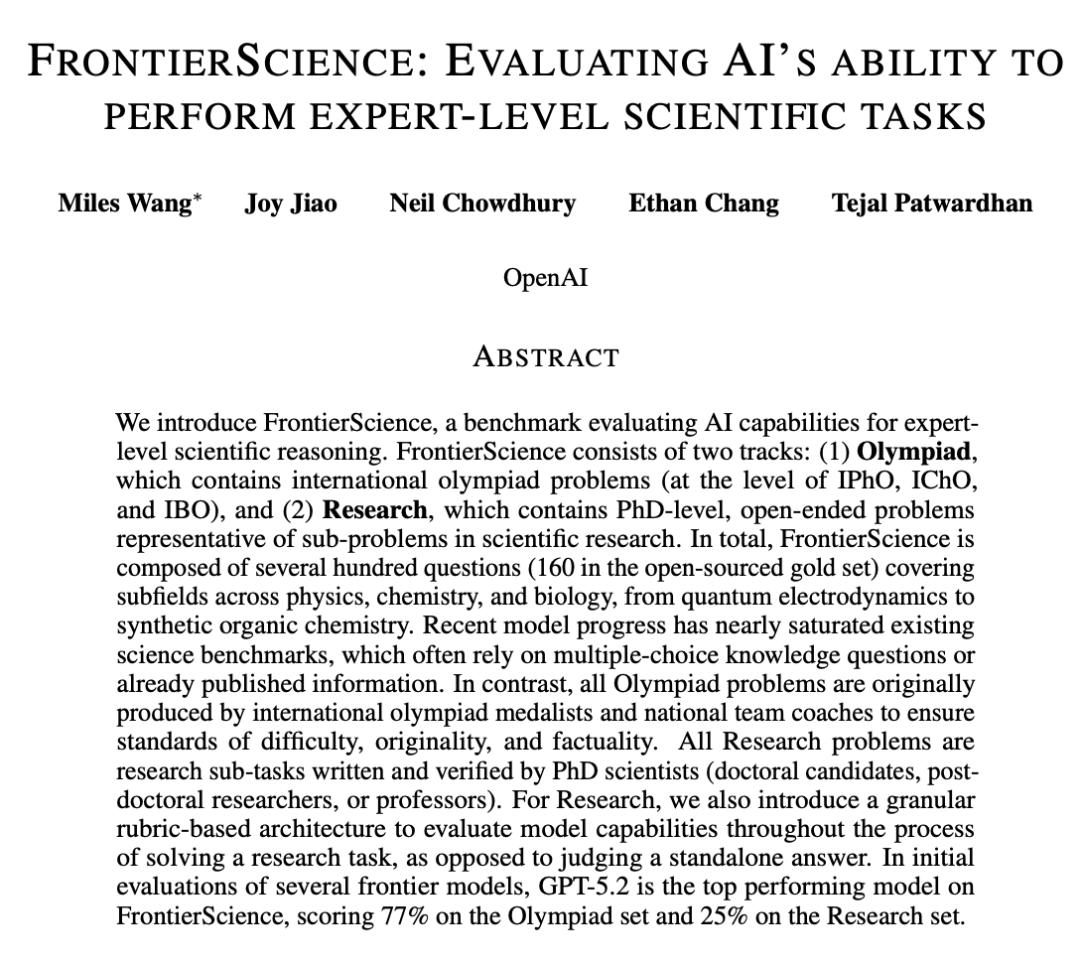 OpenAI在2025年12月16日发布了一套新基准FrontierScience,用来衡量AI在物理、化学、生物三门学科里,能否做到接近专家水准的科学推理,而不只是背知识点。