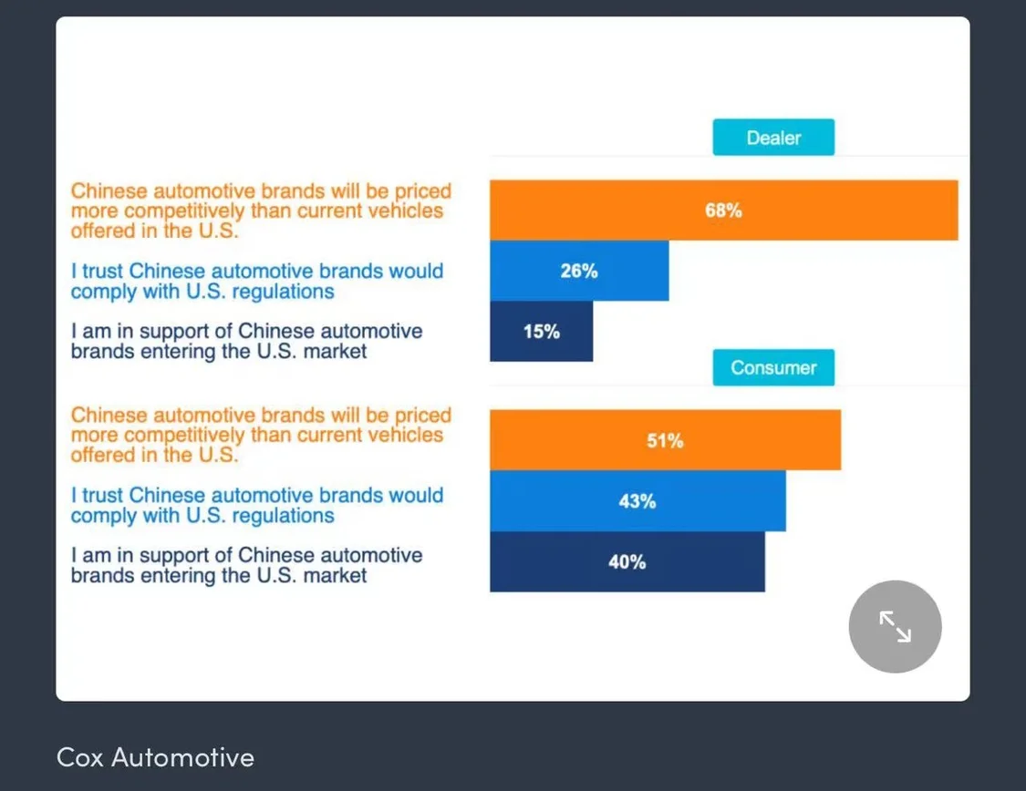 然而,当前高关税和贸易紧张局势目前阻碍了中国汽车大规模进入美国市场。40%的消费者支持中国品牌进入美国市场,但只有15%的经销商支持中国品牌进入美国市场。
