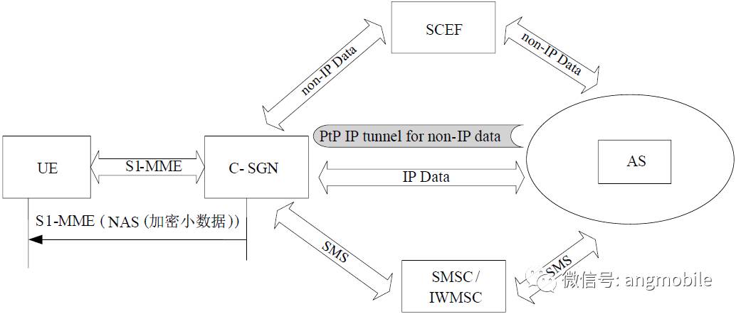 ①路径一:可以基于新的逻辑模块SCEF传输,C-SGN/MME建立一条执行SCEF的控制面PDN连接,通过这条PDN连接,UE把Non-IP数据传送给应用服务器AS。